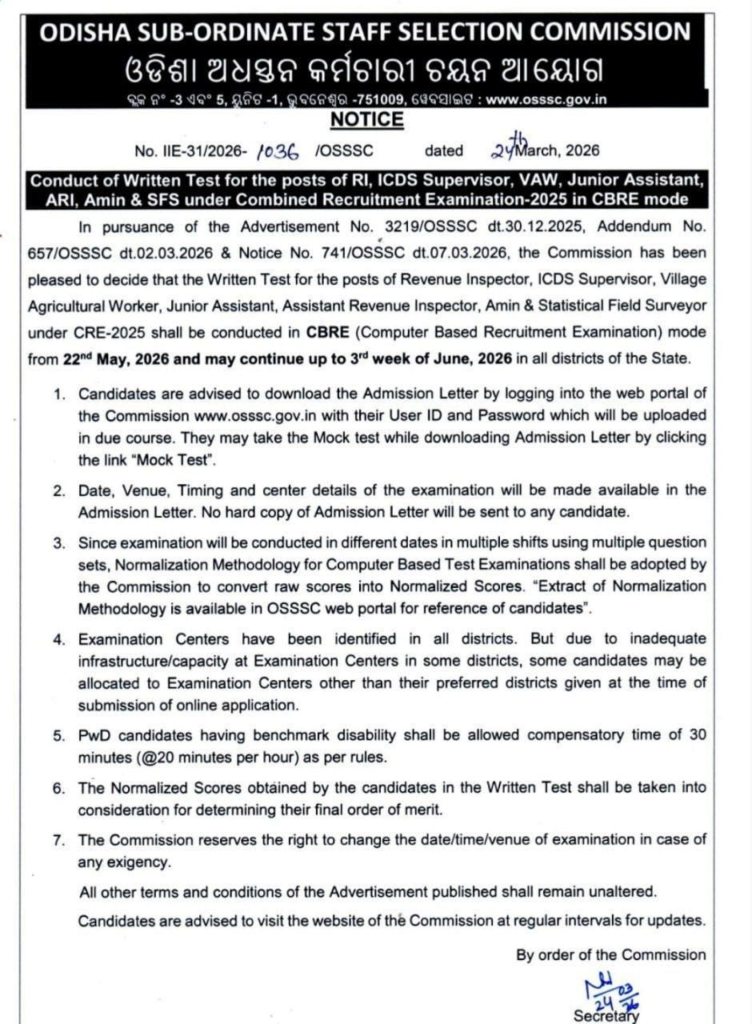 The Odisha Sub Ordinate Staff Selection Commission stated that the exam will be conducted in CBRE (Computer Based Recruitment Examination) mode and may continue till the third week of June 2026 across multiple districts.