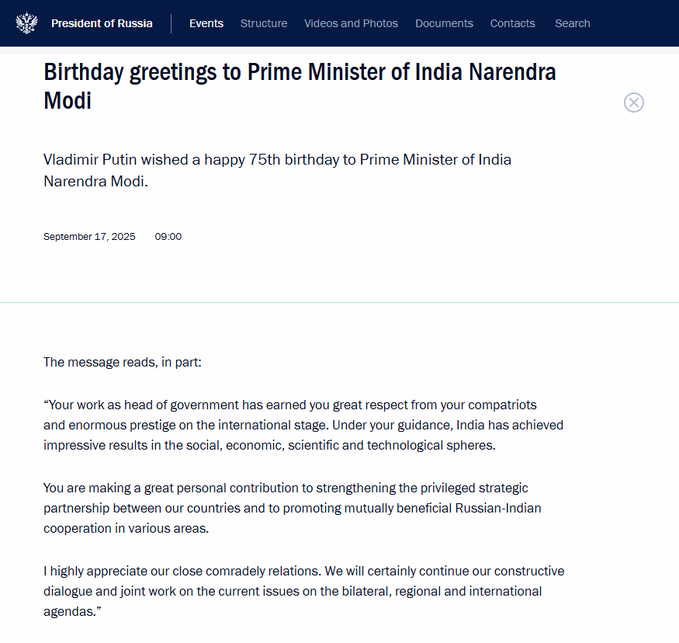 President Vladimir Putin lauded Modi for his “great personal contribution” to enhancing the India-Russia partnership. He emphasized that under Modi’s leadership, India has achieved impressive progress in social, economic, scientific, and technical fields.